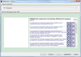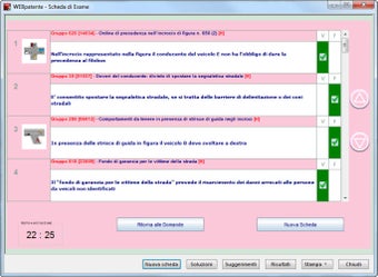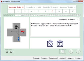 Questo software offre una simulazione realistica degli esami ufficiali della patente, la videata è praticamente identica a quella della Motorizzazione Civile. In basso a sinistra c'è un timer impostato sui 30 minuti (appunto il tempo concesso durante l'esame), scaduti i quali parte la correzione automatica. L'algoritmo effettua il sorteggio dei quesiti facendo ben attenzione a non riproporre sempre le stesse domande.
